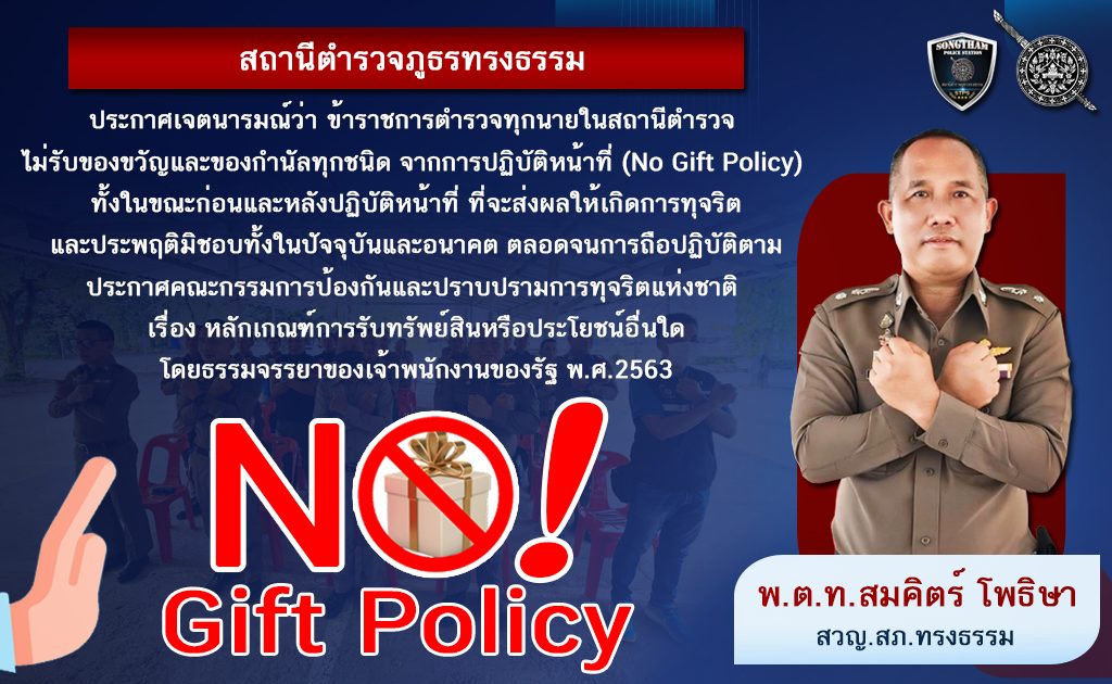 สถานีตำรวจภูธรทรงธรรม ประกาศเจตนารมณ์ว่า “ข้าราชการตำรวจทุกนายในสถานีตำรวจ ไม่รับของขวัญและของกำนัลทุกชนิด จากการปฏิบัติหน้าที่ (No Gift Policy) ทั้งในขณะก่อนและหลังปฏิบัติหน้าที่ ที่จะส่งผลให้เกิดการทุจริต และประพฤติมิชอบทั้งในปัจจุบันและอนาคต ตลอดจนการถือปฏิบัติตาม ประกาศคณะกรรมการป้องกันและปราบปรามการทุจริตแห่งชาติ เรื่อง หลักเกณฑ์การรับทรัพย์สินหรือประโยชน์อื่นใด โดยธรรมจรรยาของเจ้าพนักงานของรัฐ พ.ศ.2563