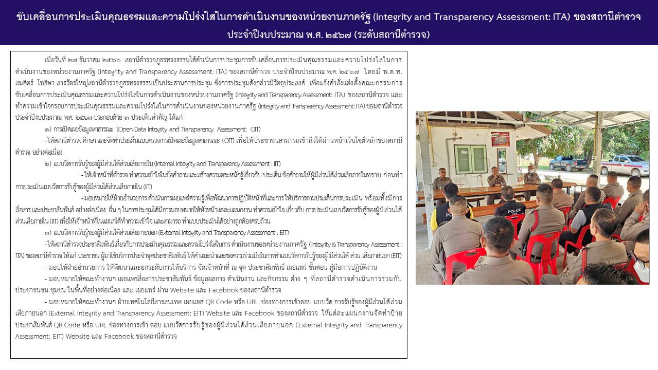 จำนวนผู้เข้าเยี่ยมชม : 93 เมื่อวันที่ ๑๙ กุมภาพันธ์ ๒๕๖๘ สถานีตำรวจภูธรทรงธรรม ได้ดำเนินการประชุมกา...