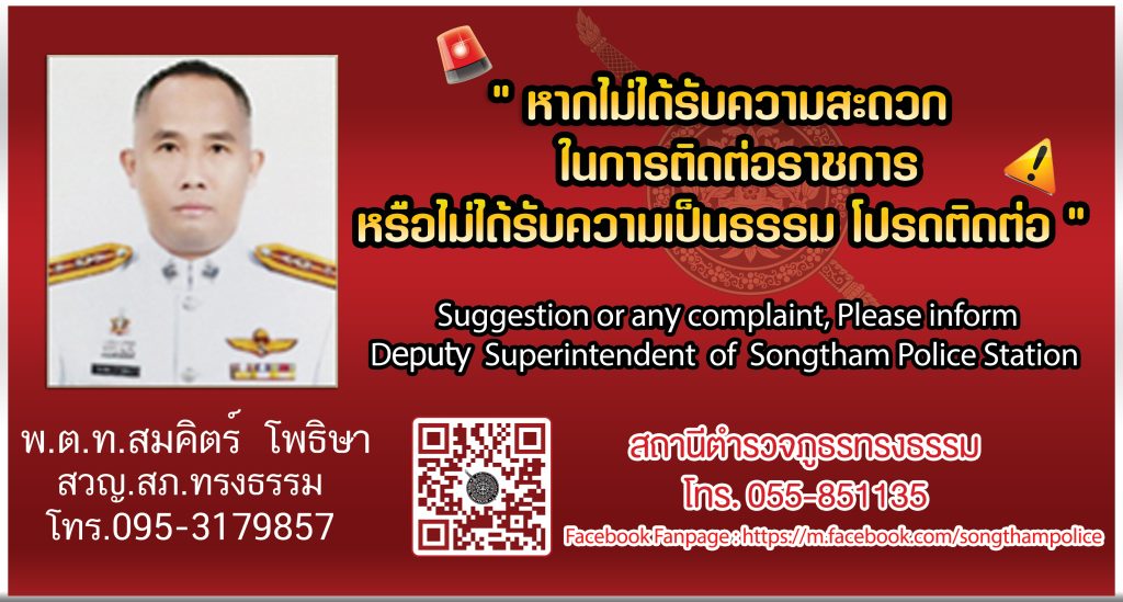 สถานีตำรวจภูธรทรงธรรมที่อยู่ : 79 ม.8 ถ.พหลโยธิน ต.ทรงธรรม อ.เมือง จ.กำแพงเพชร 62000หมายเลขโทรศัพท์ : 055-851135 ,fax: 055-851135E-mail: songthampolice.st@gmail.com